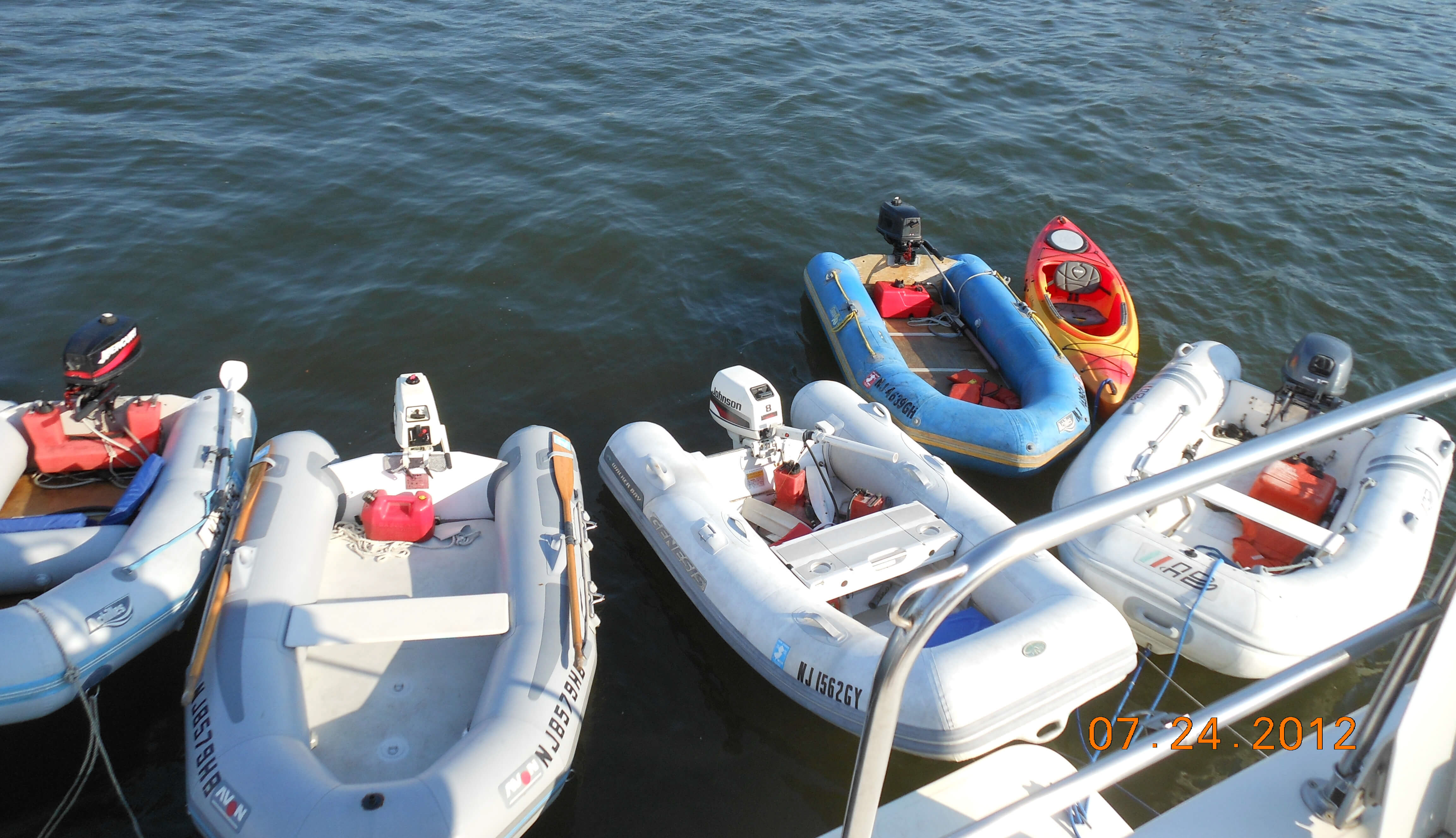 Dinghies tied to the swim platform for a gathering on the upper deck.